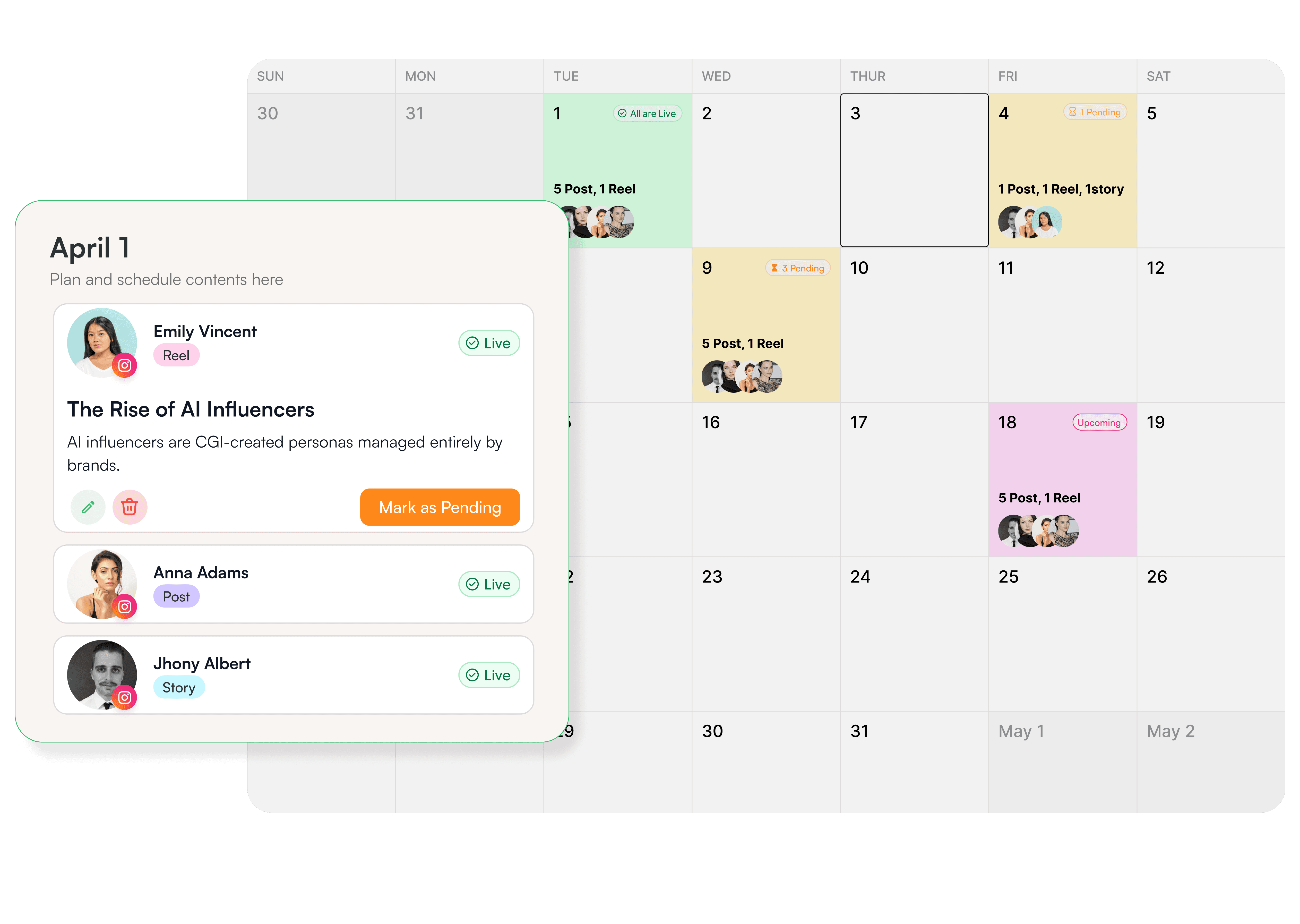 A familiar, Google Calendar-style layout makes it simple to plan influencer content for days, weeks, or the entire year.