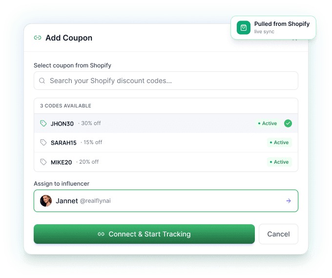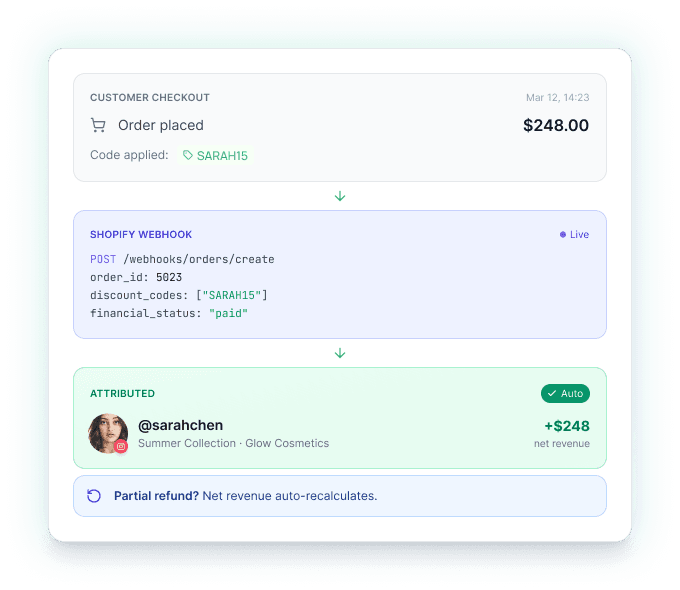 Connect your Shopify store, generate unique discount codes per creator, and watch every order trace itself back. No spreadsheets, no manual reconciliation.