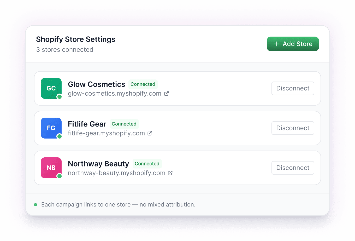Connect a Shopify store per client. Link a specific store to a specific campaign. Switch between brands without losing context. Whitelabel reports per client.