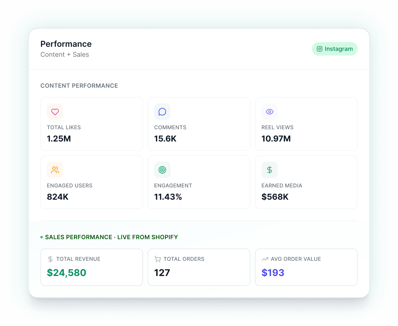 Most platforms show you either reach or revenue. Impulze shows both, side by side. Likes, comments, reel views, engagement rate, earned media value — and right below it, the orders, revenue, and AOV those posts actually drove.