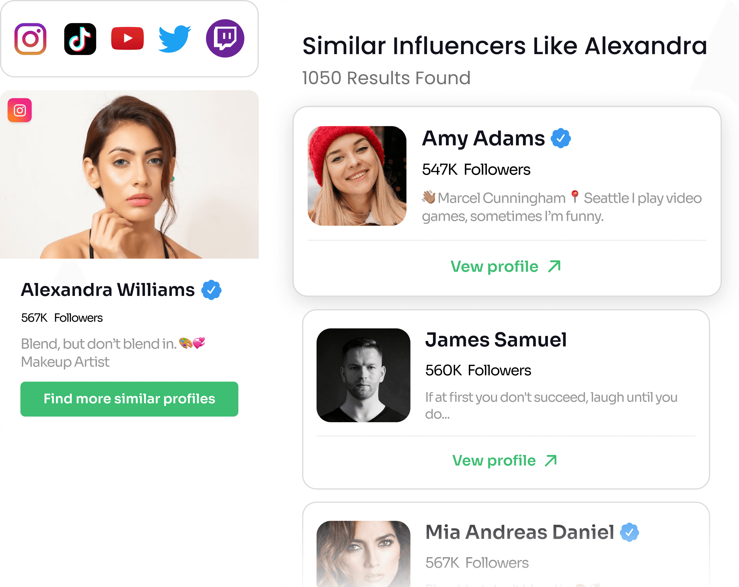 Discover Similar Profiles: Liked one influencer? Get a list of similar profiles that fit your criteria with just a click.
