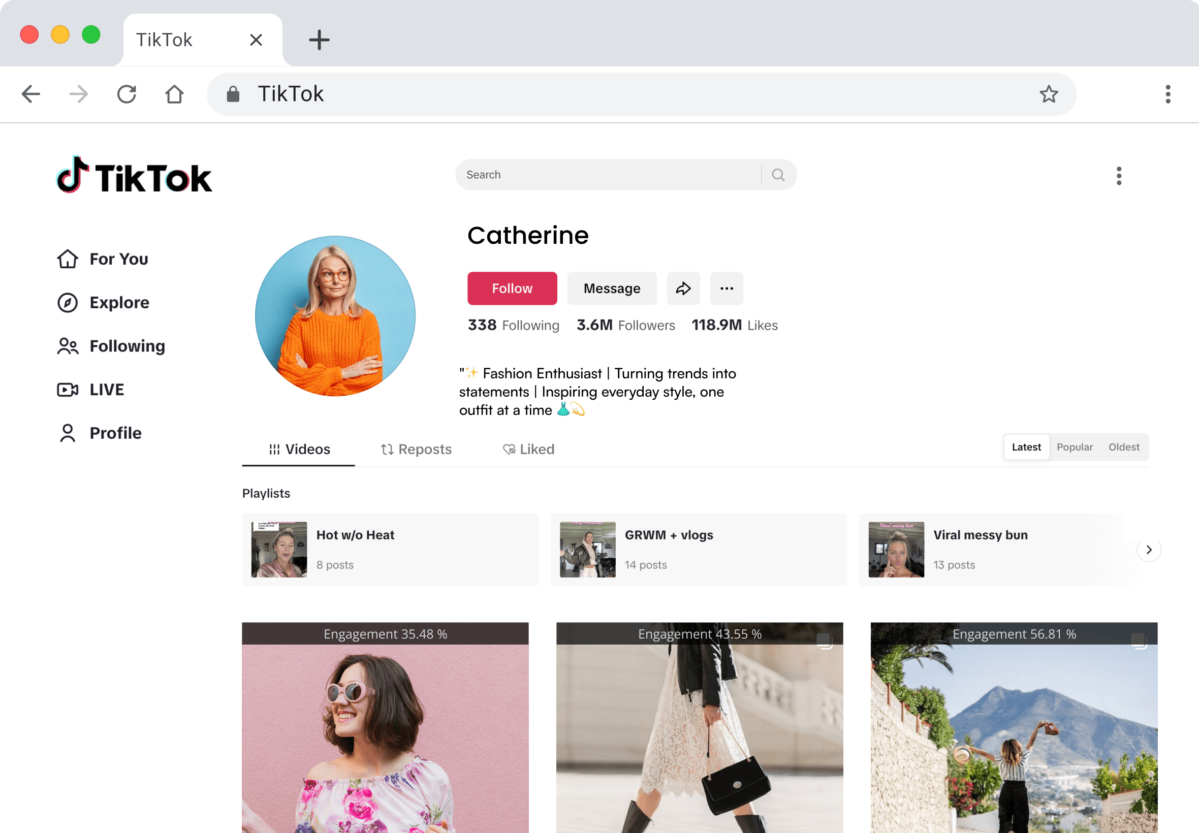 Open your TikTok feed on the desktop and go to any profile for which you want to find the TikTok engagement rate.