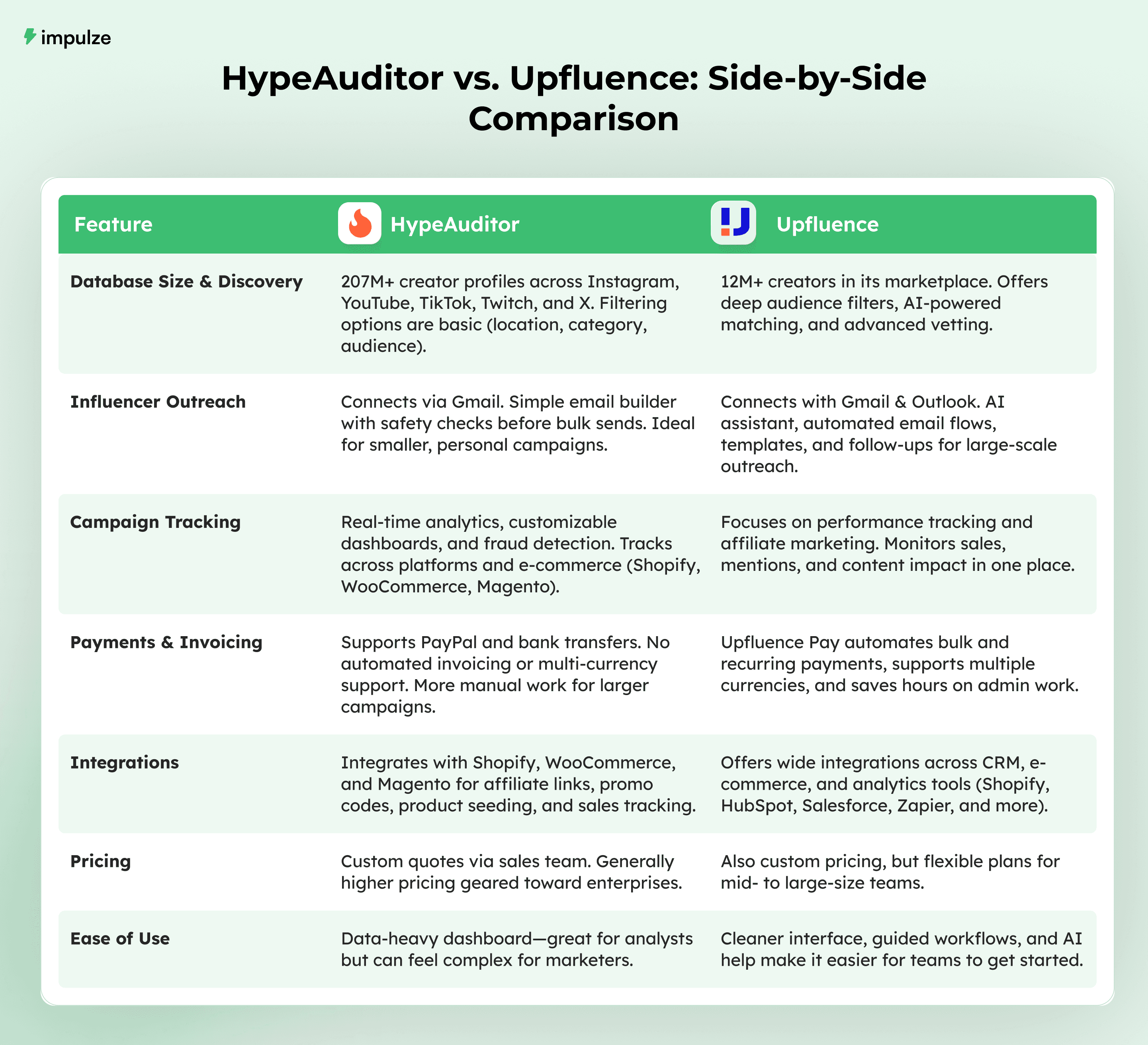 Pricing: Both offer custom pricing. HypeAuditor is suited for data-focused enterprises; Upfluence is more flexible for mid-sized brands.