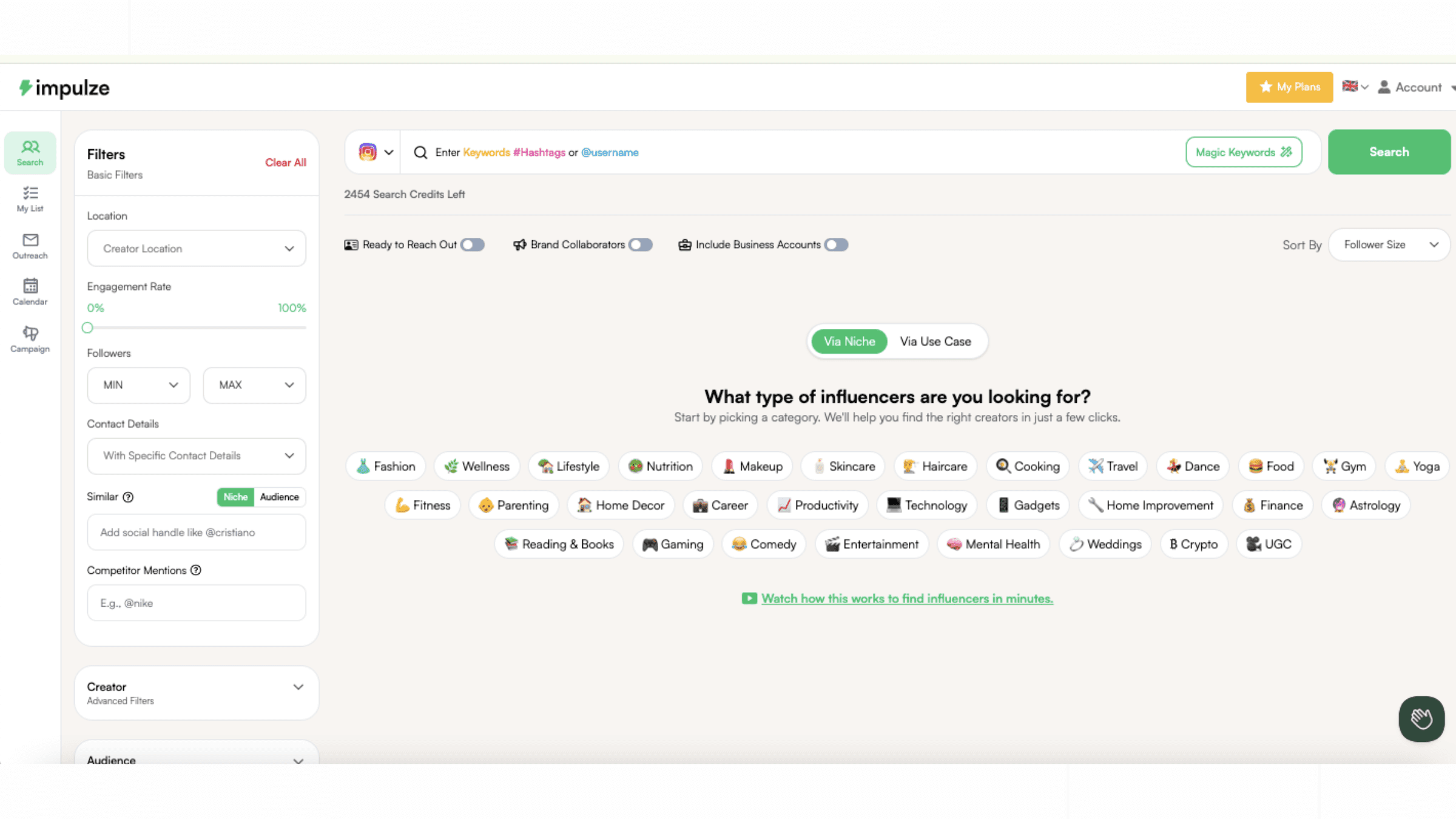 Simple. Use an influencer search platform like impulze.ai. Sign up for free, add search filters and it can give you a list of hundreds in minutes, complete with their verified contact information.