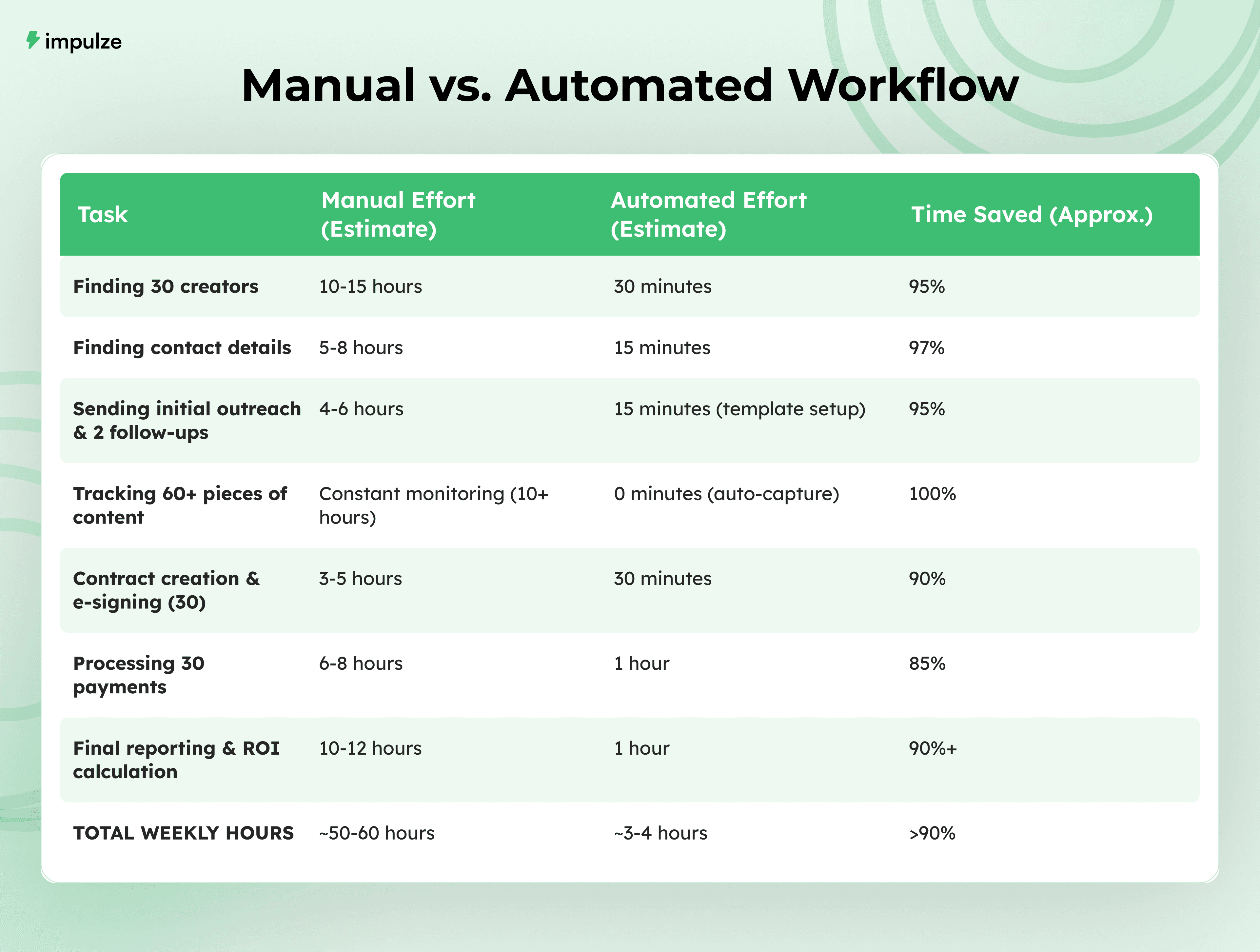 To underscore just how much time and effort you save, let's look at a quick comparison for a moderately sized campaign involving, say, 20-30 influencers: