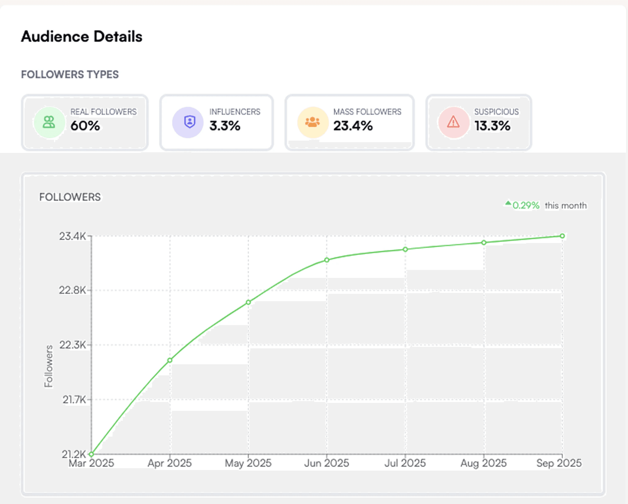 Plus, the platform also gives you a detailed profile that instantly flags "bot" behavior, shows you audience insights, and also past brand collaborations, so you can decide within minutes if the creator is worth working with or not.
