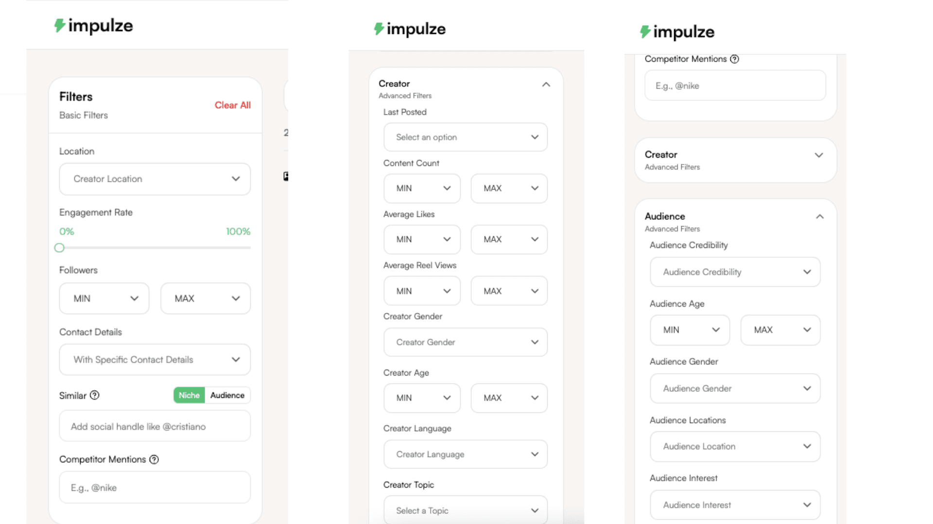 Instead of guessing which creators fit your brand, Impulze.ai filters profiles by niche, audience demographics, engagement quality, and past collaborations.